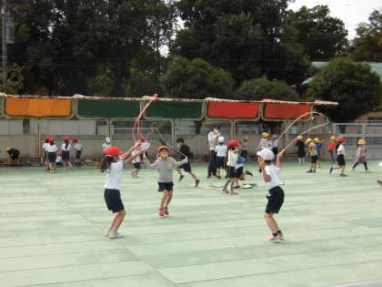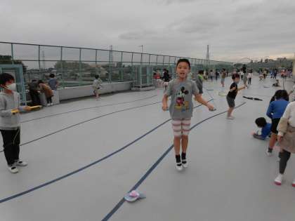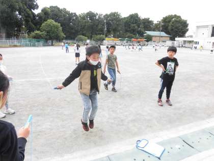 中休みのジャンピングタイムには、それぞれの活動場所で元気いっぱいに取り組み、新記録を目指して練習しています。なわとびカードの新しい技に挑戦したり、たくさん回数が跳べるように練習をして、なわとびオリンピックに挑戦したりしています。