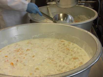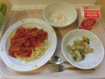 ☆今日は、子ども達のすきな「フルーツヨーグルト」です。みかん りんご パイン ももの缶詰を使用しました。その中にヨーグルトを入れて和えました。少し酸味の効いたフルーツヨーグルトの完成です。
