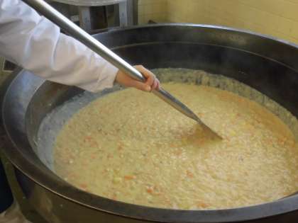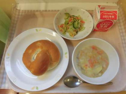 ☆今日の給食は「クラムチャウダー」です。あさりがたくさん入っています。あさりを入れると、更にうま味が増します。今日も給食室でたくさん作りました!