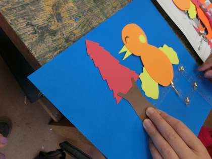 支柱になる部分の動きから内容を考え、動物が追いかけっこをする様子や、卵から恐竜が生まれる作品など、細かい部分まで工夫された楽しい作品が仕上がりました。