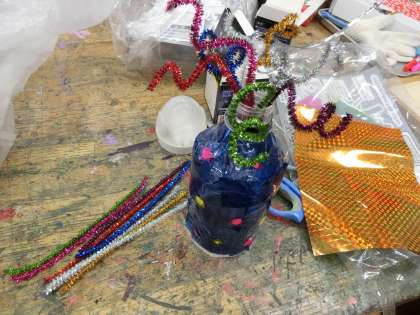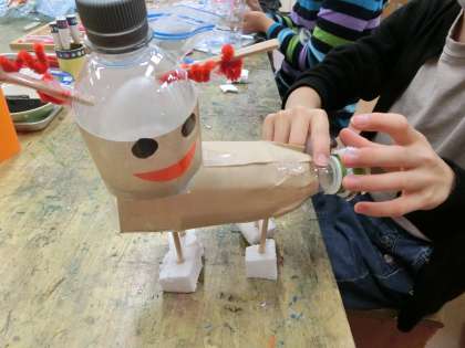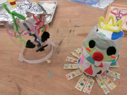 4年生は、家庭で不要となったペットボトルやプラスチックケースなどを使って、素敵なランプをつくりました。カラーセロハンや、モールなど、いろいろな材料と組み合わせて、一人一人が自分の思いに合わせて表現することができました。