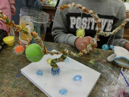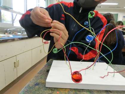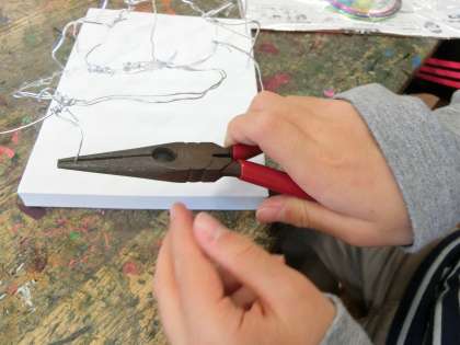 5年生は、アルミ線や針金を使って作品づくりに取り組んでいます。一人一人が表したい世界を想像し、ラジオペンチで針金を切ったり曲げたりしながら、工夫して作品をつくっています。