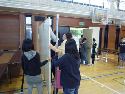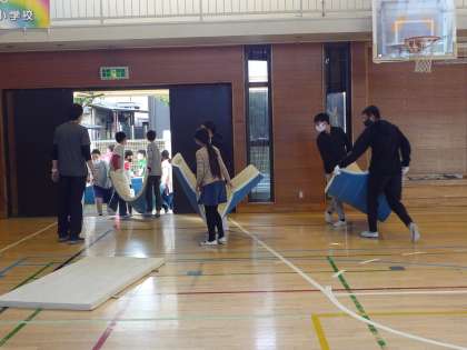 体育館のマット等を片付けて、パネルや長机などを運びました。