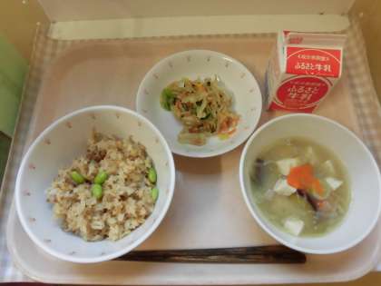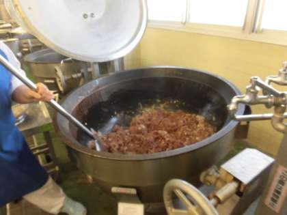 ☆今日の「むろあじのそぼろごはん」むろあじは、東京都八丈島産から取り寄せました。鰺(あじ)は、ミンチして納品してきますので、その鰺(あじ)を給食室の大釜で炒めて調味しました。そして炊いたご飯に混ぜて完成です。