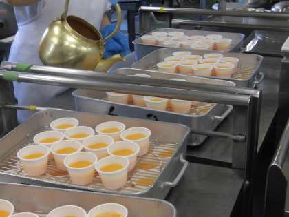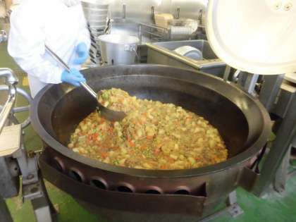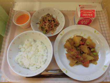 ☆今日のデザートは「キャロットゼリー」です。キャロットゼリーの中には、にんじんを茹でて細かくしたものが入っています。ゼリーを食べやすくするために、オレンジジュースで作っています。そして、カレー肉じゃがは、ごはんは進む1品です。
