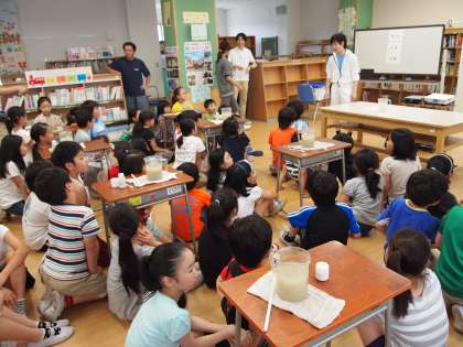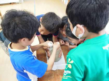浄水場の仕組みをお話していただき、そのあと実際に汚い水を浄化する方法を実験しました。子どもたちは、目を輝かせて実験に取り組んでいました。