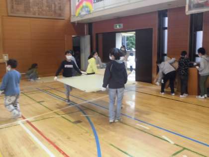 20日、21日に行われたブックフェスティバルの片付けを5校時に5年生が行いました。大きなパネルや本、机などみんなで協力して片付け、体育館を復旧させました。最後は横一列に並んで全員でぞうきんがけをしました。「お仕事ありませんか?」を合い言葉に一生懸命取り組む姿がとても立派でした。来年は最高学年としてもっともっと活躍の場があるでしょう。とても楽しみです!5年生、ありがとう!!