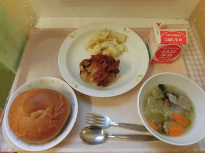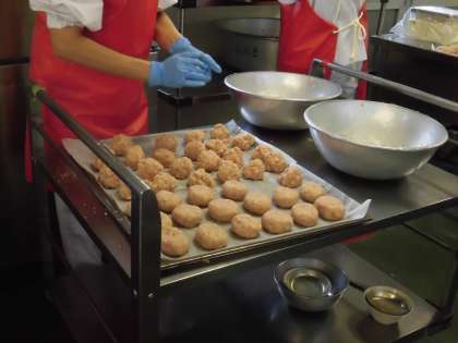 ☆今日の「ヘルシーハンバーグ」には、おからがたくさん使われていて、とてもヘルシーにできました。豚挽き肉や玉葱のみじん切りも入っています。おからが入ることにより、全体のボリュームも出て食べごたえもあり、なおかつ子ども達もよく食べるメニューです。