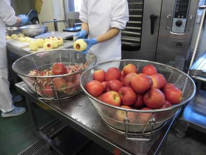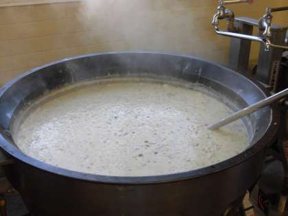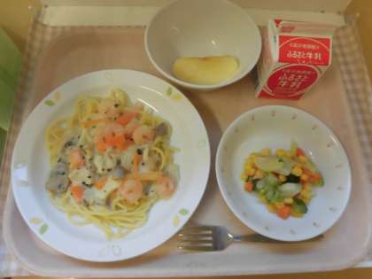 ☆今日は、今が旬のきのこを使用したスパゲティーです。給食室の大釜でクリームソースを作り、旬のしめじを入れました。きのこが苦手な子も、クリームソースにパスタを絡めて食べている様子を見ることができました。