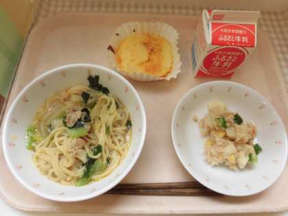 ☆今日は、子ども達の好きな「たんめん」と「ヨーグルトポムポム」です。ケーキの方は、今が旬のリンゴをイチョウ切りにして、ケーキ生地に和えました。ヨーグルトも入っているので、全体的に甘酸っぱい優しい味に完成しました。