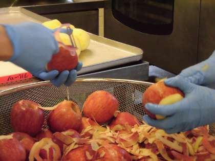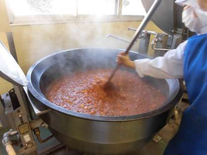 ☆今日の献立は「ハッシュドポークライス」です。豚肉で作られたハヤシライスになります。今日は、持久走大会でしたが、疲れた体を回復させるには、栄養をとり疲労回復に効果があるビタミンB1を多く含む豚肉などを食べることが大切です。給食室では大釜でたくさんのハッシュドポークを作りました。