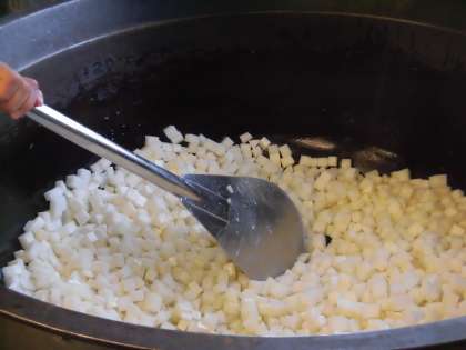 ☆今日は「世田谷育ち給食」です。今日は、烏山北9丁目にある畑で育った大根を使って「大根カレー」を作りました。油で一度大根を炒めることにより、大根の本来のあまみや、味も入りやすくなっています。