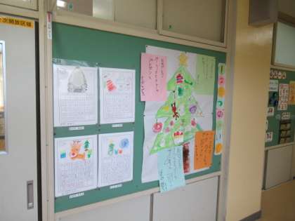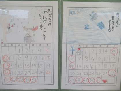 つくし学級の廊下の掲示は、「12月の俳句」です。冬の季節の言葉を考えました。12月の季節にかかわる絵を描き、俳句を作りました。12月の季節がわかる素敵なカレンダーができました。