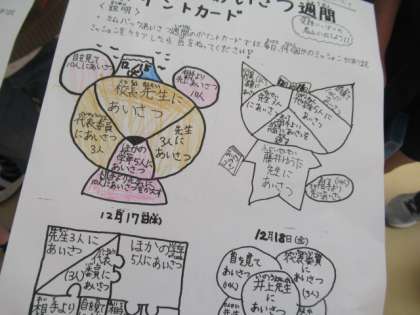 先週、あいさつ週間が終わりました。しかし、もっと、あいさつをする必要があるということで、代表委員会から提案があり、今週、「カムバックあいさつ週間」が今日から始まりました。代表委員がたすきをつけてあいさつをしています。あいさつをするだけポイントがたまるカードを、代表委員会で作成し、子どもたちは、ポイントをためようとあいさつをがんばっています。あちこちで、あいさつが聞こえる1週間になりそうです。