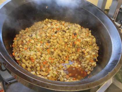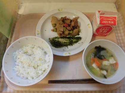 ☆今日の給食の「いりどり煮」は今が旬の里芋がたくさん入っています。里芋は古くから食べられているものです。里芋の栄養としては、体内の余分な塩分を排出するカリウムが多く含まれている所が特徴です。給食室では大釜で、じっくり里芋を煮込みました。