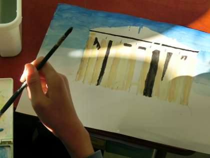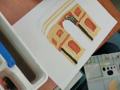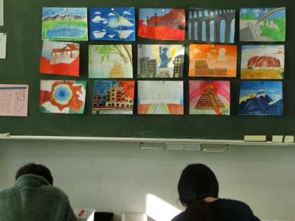 6年生は<行ってみたい世界遺産>をテーマに描きました。なぜ、その場所を選んだのかを尋ねると、「過去の歴史のことを知って、この先も大切にしていくべきだと感じたからです。」「このキレイな風景を、お母さんに見せてあげたいからです。」「家族みんなで旅をするならココかな?と思いました。」など、さすが6年生!!という返答がたくさんあり、胸が熱くなりました。