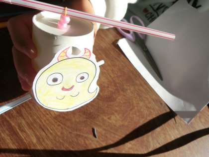 基本的な形は全員同じなのですが、タコのように足をたくさん付けたり、紙バネを作って飛び出る手を付けたり、自分好みにアレンジをして楽しみました。作品発表会では、お互いの作品を見て工夫した点を伝えあったり、一緒に遊んだり大盛り上がりでした。