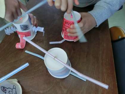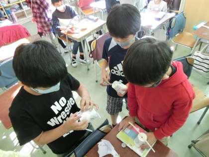 2学期も終わりに近づき、図工の授業も残り少なくなってきました。3年生は、ストローや紙コップ、輪ゴムなど家庭にある材料を使って、動かして遊ぶおもちゃをつくりました。