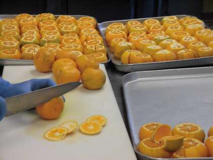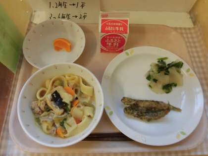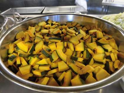 ☆今日は冬至給食です。冬至とは1年のうちで、一番夜が長い日です。この日は昔から、冬に不足がちなビタミンを補給するために南瓜を食べたり、ゆずをお風呂に入れた「ゆず湯」に入る習慣があります。ほうとうには南瓜 サラダには柚の皮を入れてみました。