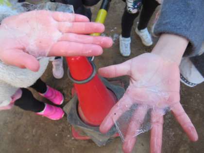 今日の朝、観察池に子どもたちが群がっていました。何かなと思ったら、池に氷がはって大騒ぎ。「冷たい!」と言って手にもって冬の寒さを感じていました。今日は、冬至の日ですね。