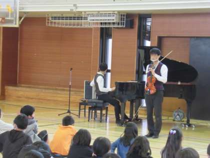 「エバリー」という演奏グループの方に来てもらって、ミニコンサートを行いました。プロの方による演奏を楽しみました。子どもたちが知っている曲を弾いてくれました。今日が4年生、10日の日にそれ以外の学年が聴きました。