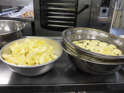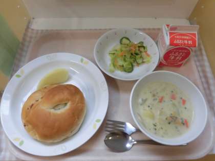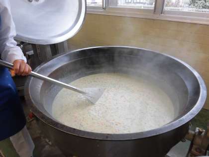 ☆今日の給食は「クラムチャウダー」です。クラムチャウダーとは、アメリカの代表的なスープの1つで、ハマグリやあさり等の貝類と彩りの野菜を使った具だくさんのスープです。今日も給食室で大釜でたくさんつくりました。あさりの旨味も絶妙です。