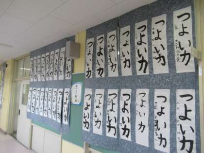 1年生と2年生は硬筆で書きました。3年生は毛筆で「つよい力」を書きました。