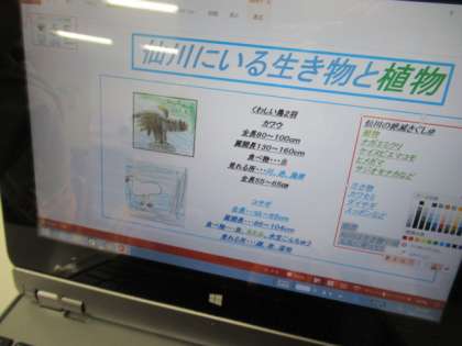 3年生は、総合的な学習の時間で、烏山の地域の様子を調べました。自分が調べたことをパソコン上で表現しました。習ったローマ字でローマ字打ちをして出来上がりました。それぞれ、見やすく分かりやすいように、レイアウトや言葉の使い方を工夫して作りました。