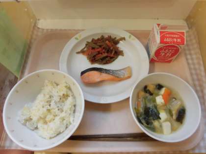 ☆1月24日〜30日は、全国学校給食週間です。この週間は学校給食を通して食に関する正しい知識と食習慣を身につける事を目的にしています。学校給食は明治22年に山形県鶴岡町で、貧しい子どもたちのために食事を出したのが始まりとされています。当時の給食はおにぎり 塩鮭 漬物とシンプルでした。今週の給食は、昔の給食をイメージして作っています。