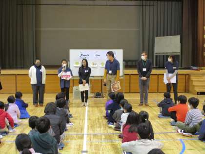 Touch the World歓迎大使のエミリー先生と6名のALTの先生がいらっしゃいました。なんと、昨年まで烏山小学校でALTをしてくださっていたアニーク先生にも会うことができ、子どもたちはとても嬉しそうでした。