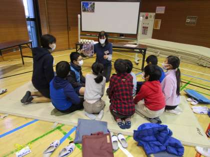本日の1・2校時に、体育館で英語・多文化教室が行われました。本来であれば、バスに乗って、教育センターへ行き体験していますが、今年は烏山小学校に出張して体験させていただきました。