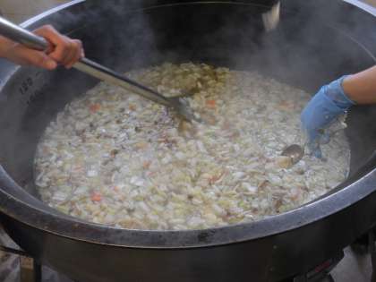 ☆今週は全国学校給食週間です。今日は昔ながらの「すいとん」です。室町時代から食べられている郷土料理になります。戦時中では、食糧事情が悪くお米の代わりに、水でといだ小麦粉を汁の中に入れて食べました。今日は給食室で大釜の中ですいとん汁をたくさん作りました。