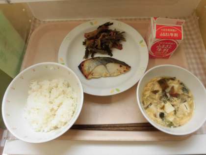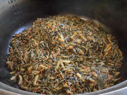 ☆今日は「茎わかめのきんぴら」です。茎わかめとは、わかめの芯の部分をカットして加工した食品のことです。給食室の大釜で、茎わかめ ぶたにく にんじん ごぼう こんにゃく さつま揚げを炒め調味料を入れました。具だくさんなきんぴらの完成です。