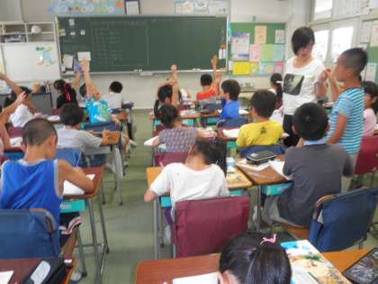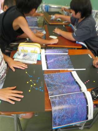 3年生は算数の授業をしていました。自分の考えを先生に見てもらいたくて一生懸命に手を挙げています。4年生は自分の好きな星座を星の等級ごとに色を変えて作っていました。みんなとても楽しそうです。