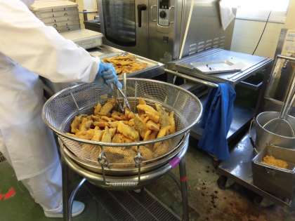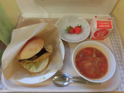☆今日の給食は「セルフフィッシュサンド」です。給食室では、シイラという魚に小麦粉とパン粉をつけて給食室で丁寧に1つ1つ揚げました。子ども達はパンに魚を挟んで、美味しそうに食べてる様子を見ることができました。