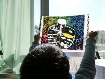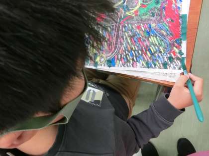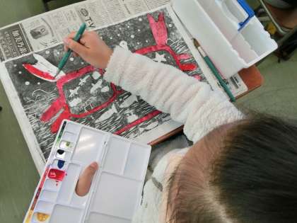 2学期に彫刻刀を使って彫った<不思議なつぼ>で版刷りした和紙に、裏彩色というテクニックを使って彩色をしました。水を多めに溶いた水彩絵の具を絵筆につけて、緊張しながら白黒作品の裏側に色をのせていきました。