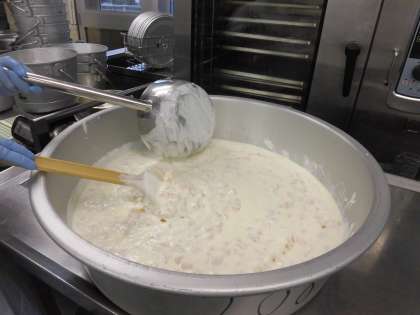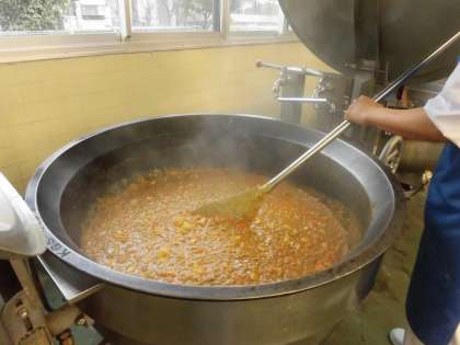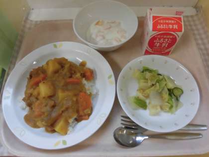 ☆今日の給食は子ども達が大好きな「ポークカレーライス」です。カレーに使われている豚肉は、子どもの成長に欠かせない良質なたんぱく質が多く含まれています。今日も給食室でたくさんのカレーを作りました。