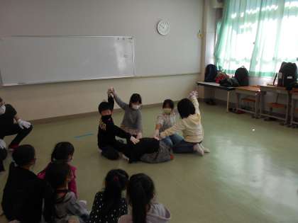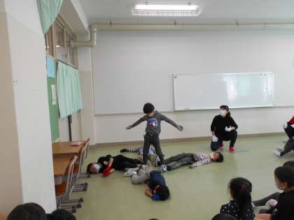 また、「一つしかない花」では、種から芽が出て、花が咲くまでをグループごとに相談しながら表現しました。どのグループもそれぞれにストーリーがあり、どのように動くかを一生懸命相談していました。人数が増えた分、途中で話し合いがうまくいかず、グループで表現する難しさも感じていたようですが、それでも一つのものを作り上げる楽しさや友達の表現のよさをたくさん感じ、満足そうな顔をして授業を終えました。