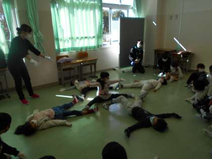 多目的室を水族館に見立てて「魚」になったり、「一つしかない花」になったりしました。最初はお腹を床に付けて魚になっていましたが、指導者の「プリンちゃん」の一言で立体的な魚になり、体を自由に動かしながら水族館を泳ぐことができ、子どもたちの発想力に驚きました。