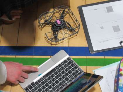 上祖師谷中学校体育館にて、STEAM教育をテーマとして技術科「ドローンのプログラミング」の授業が行われました。今回は、障害物を回避しながら、いち早くドローンをゴールに導くためのプログラミング方法について生徒たちが考えを出し合いました。