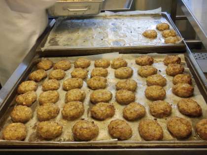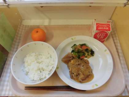☆今日の給食は「和風ハンバーグきのこソース」です。ハンバーグの生地に豆腐も入れてみました。豆腐を入れることによって柔らかく出来上がります。今日も調理員さん達が心を込めて1つ1つ作って下さいました。