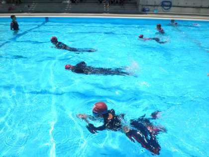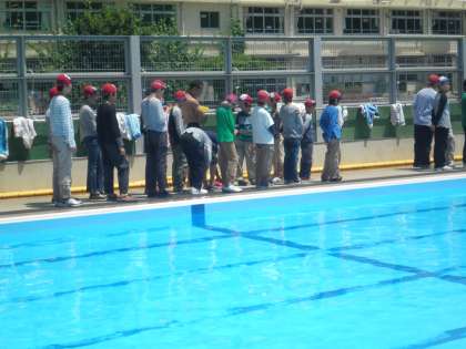 自分の命を守るために、服を着て水に入った感覚や、どう対処すれば良いかを学びました。また、平泳ぎやクロールを泳いで、服を着て泳ぐ感覚も体験しました。 着衣泳は毎年、夏休み前に4年生と6年生がやっています。
