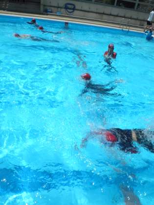 今日は、4年生と6年生が着衣泳をしました。水の事故は、水着を着ている時よりも、ふだん着のときの方が多いといわれています。