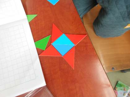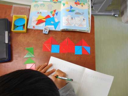 1年生は算数科の学習で「かたちづくり」の学習を始めました。色板を使って形を作る学習では、ずらしたり、回したり、裏返したりしながら、いろいろな形を作りました。三角の色板だけでもいろいろな形を作れることに気付き、驚いている人もいました。みんな楽しくかたちづくりに取り組んでいました。