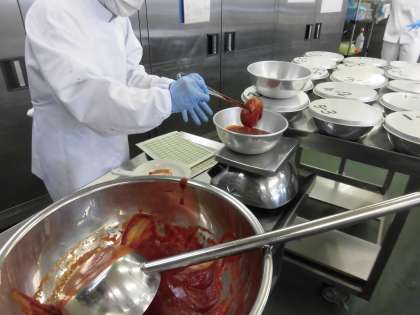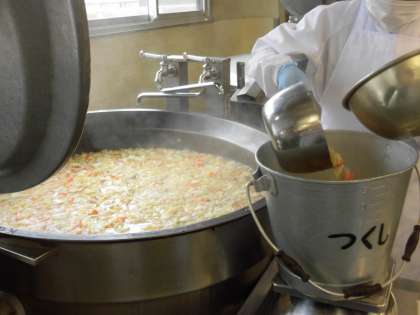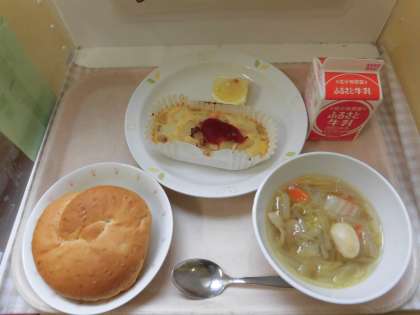 ☆今日は「ポテトオムレツ」です。給食室では、たくさんの卵を割って、じゃがいもを蒸して、たまねぎ ひき肉を炒めで塩 こしょうで味付けをしました。1つ1つカップに入れてオーブンで焼いて完成です。
