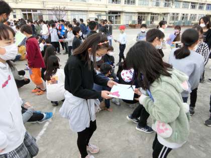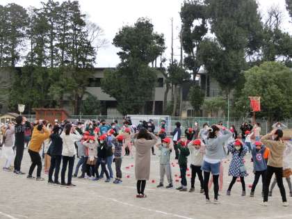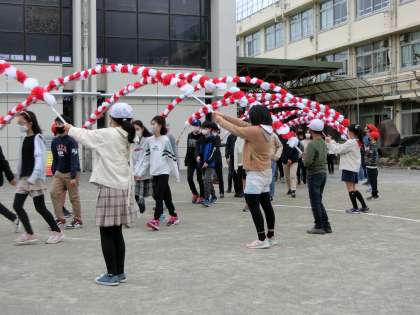 本日1・2校時に6年生を送る会を行いました。今年度は感染症予防対策として校庭で学年ごとに6年生とたま入れ対決を行いました。お世話になった感謝の気持ちは持ちつつ、勝負は勝負としてどの学年も真剣に6年生と対決しました。また、1年生は6年生と一緒に「チェッコリたまいれ」をしました。1年生のころに踊った以来のチェッコリダンスを少し恥ずかしそうにしながらも、楽しそうに踊っていました。