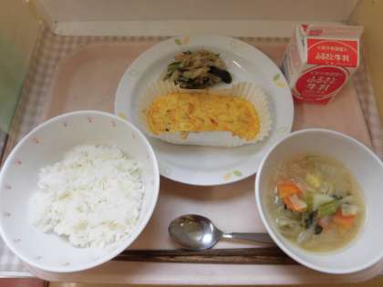 ☆今日の給食は「擬製豆腐」です。豆腐料理の1つで、豆腐を細かく崩したものに卵や野菜を混ぜて焼いた料理のことを言います。精進料理とも言われていて、ヘルシーな料理の1つです。