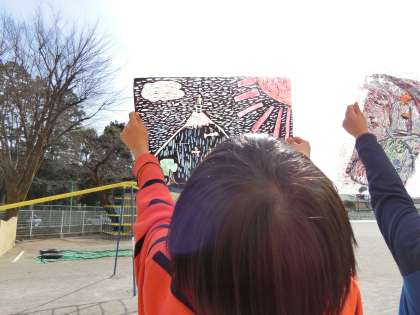 「太陽の光の下で見ると、どんな風に見えるのかな?」と意見があがったので、みんなで外に出て作品鑑賞会をすることになりました。図工室の中で見るよりも鮮やかに輝く作品をみて大きな歓声が沸き上がりました。