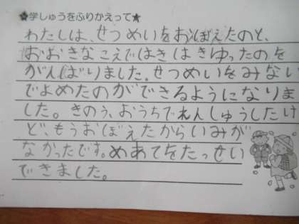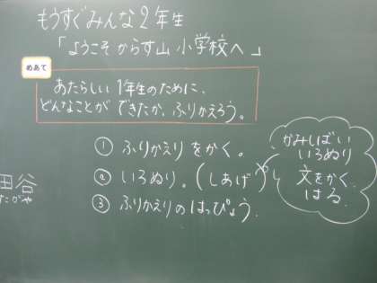 新しい1年生を迎えるために、1年間でどんなことができるようになったか振り返り、2年生への希望をもちました。1年生は、新しい1年生のために、学校を紹介する動画を作りました。
