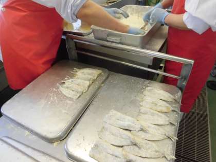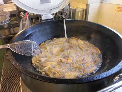 ☆今日は「いわしのから揚げ葱ソース」です。小骨が多い魚ですが、子ども達の噛む力をつける為に時々献立に入れています。今日も給食室の大釜でたくさんのいわしを揚げました。